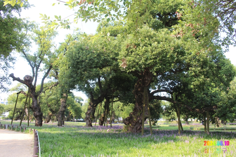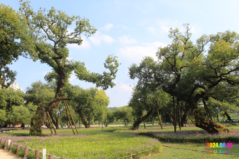 거대한 왕버들과 그 그늘 아래서 보라색 꽃을 피운 맥문동이 잘 어울린다.