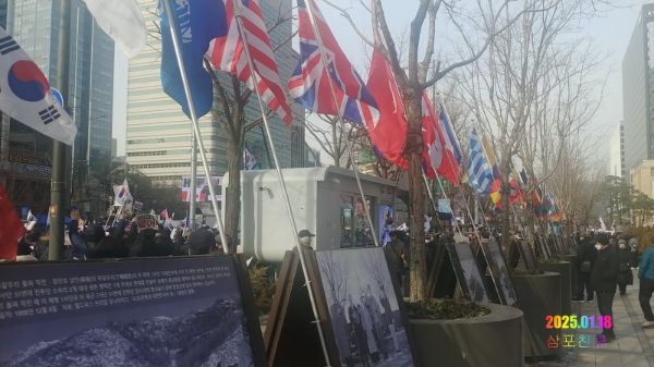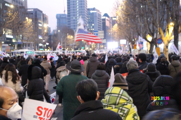 변함없이 많은 애국시민들이 태극기를 흔들며 모여있다.
