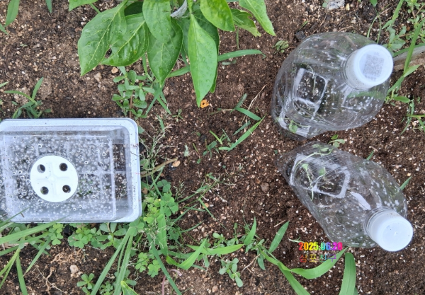 웃자란 백일홍은 불안하지만 패트병으로 씌워주고..